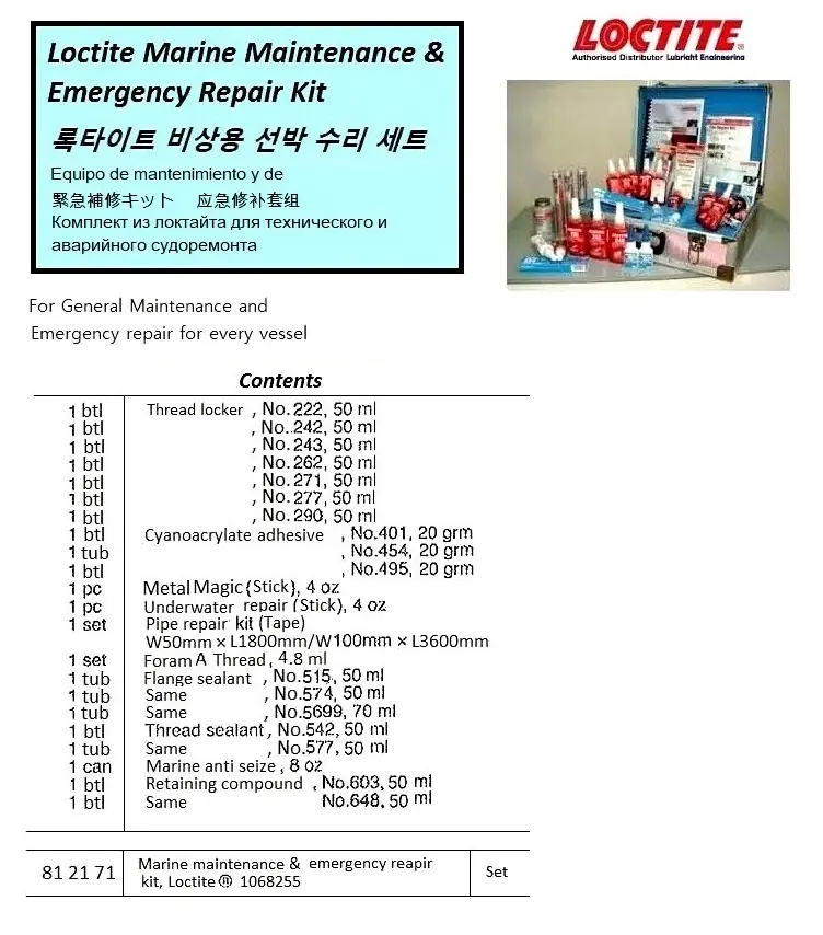 | Description | MARINE MAINTENANCE & EMERGENCY REPAIR KIT, LOCTITE #1068255 |