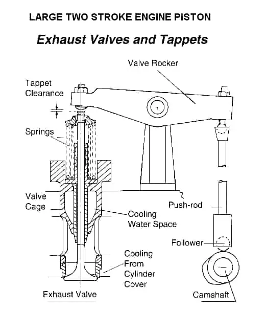 LARGE TWO STROKE ENGINE PISTON DIAGRAM, EXHAUST VALVES AND TAPPETS